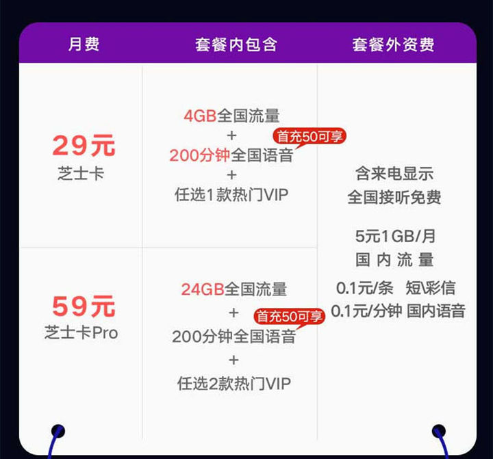 套餐29元/月,免费接听全国无漫游费,