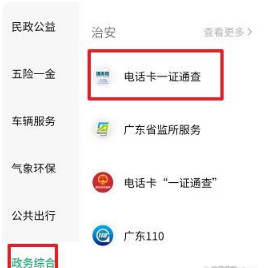 第三步:在页面底部切换至【办事大厅】,点击【政务综合】,滑动至治安内容,点击【电话卡“一证通查”】。