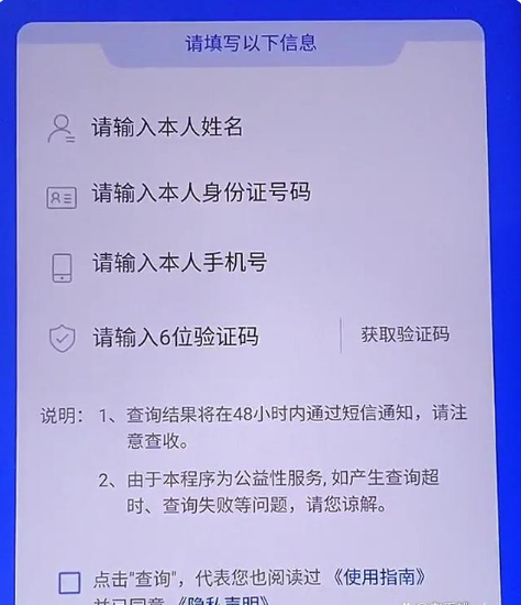 第四步:根据页面提示填写相关信息,完成后点击下方的【查询】。资料提交成功后,查询的结果会以短信形式发送到我们的手机上。